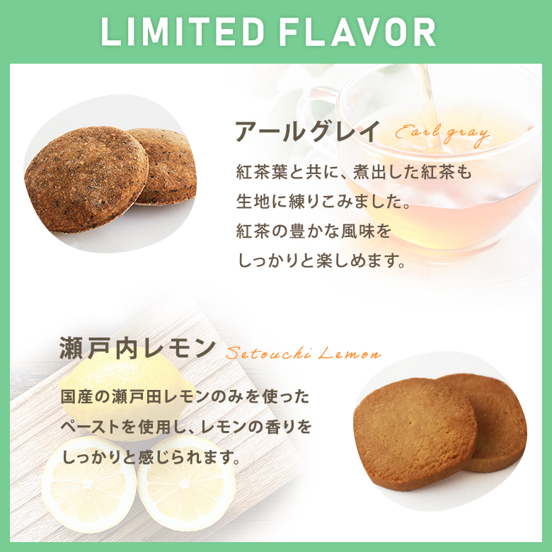 どちらのタイプも「ゴマ」「アールグレイ」「瀬戸内レモン」「ゆずはちみつ」の4種類をご用意しております。