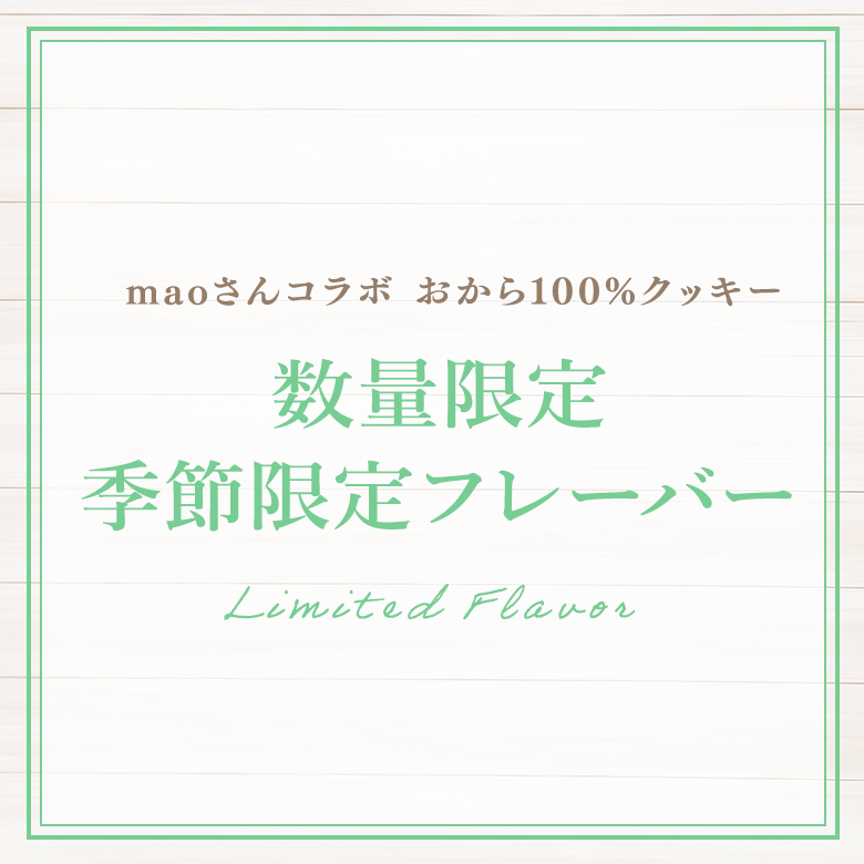 「ゆるダイエット」を発信する大人気インスタグラマー「maoさん」とのコラボ商品、グルテンフリーのおから100%クッキー。おからクッキーに食べ慣れてない方にもオススメの「ザクほろタイプ」と、脂質が気になる方にオススメの「かためタイプ」の2パターンから選べます。